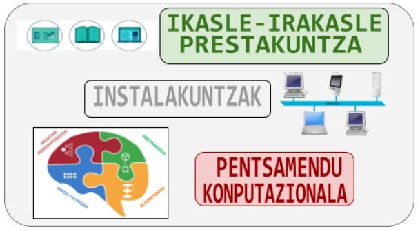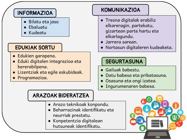 IKT Proiektuaren helburu nagusia Ikasleen irteera profila, irakaslearen gaitasun digitala eta administrazioaren kudeaketa Europako DIGCOMP markora egokitzea da. Horretarako markoak ezarritako bost atalak garatzen ditugu.